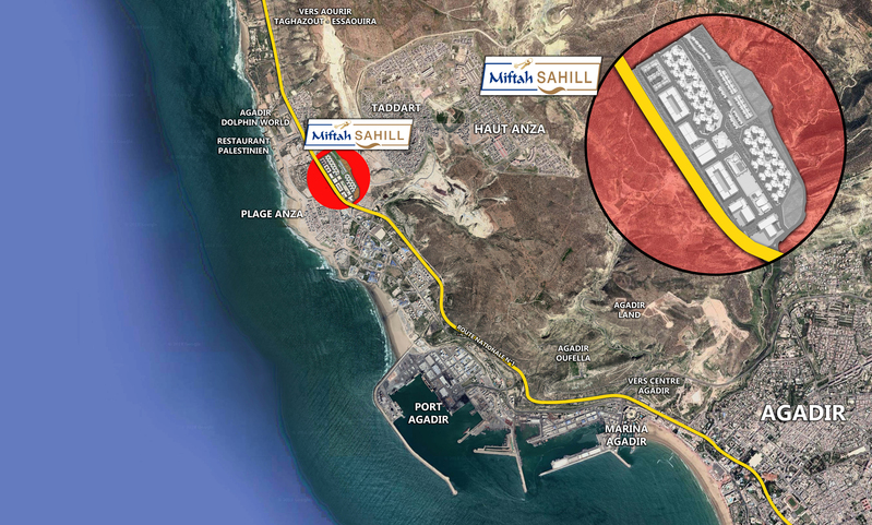 Le projet Miftah Sahill jouit d’une situation exceptionnelle dans la ville d’Agadir, puisqu’il se trouve à 500 m seulement de la plage d’Anza, sur la route nationale n°1. Mitah Sahill fait également figure de projet « tout-en-un » ; et pour cause, il a été conçu de manière à intégrer tous les équipements nécessaires aux besoins et attentes de ses futurs résidents au quotidien : écoles, mosquée, clinique, centre socio-culturel, espaces verts, hôtel, poste de police,…